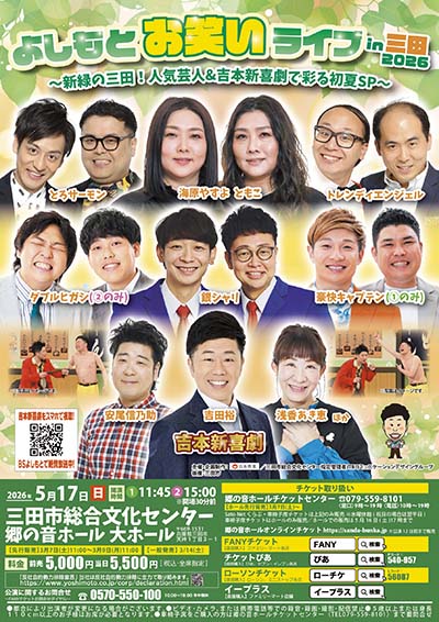 | 5月17日(日) | ![]() | よしもとお笑いライブ in 三田 2026 ~ 新緑の三田!人気芸人&吉本新喜劇で彩る初夏SP ~ 時間:【①開演】11:45 【②開演】15:00 場所:郷の音ホール 大ホール 料金:前売り 友の会4,500円 / 一般5,000円 / 当日 5,500円 |