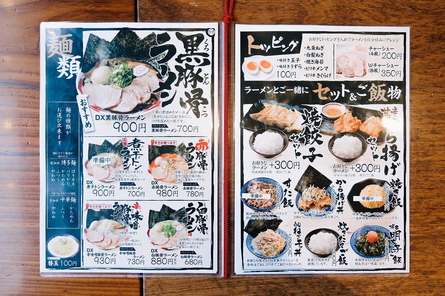 メニューは、メインとなる豚骨ラーメンが白・黒・赤の3種類。それぞれトッピング違いで、ベーシックとデラックス(DX)のバリエーションがありますよ。