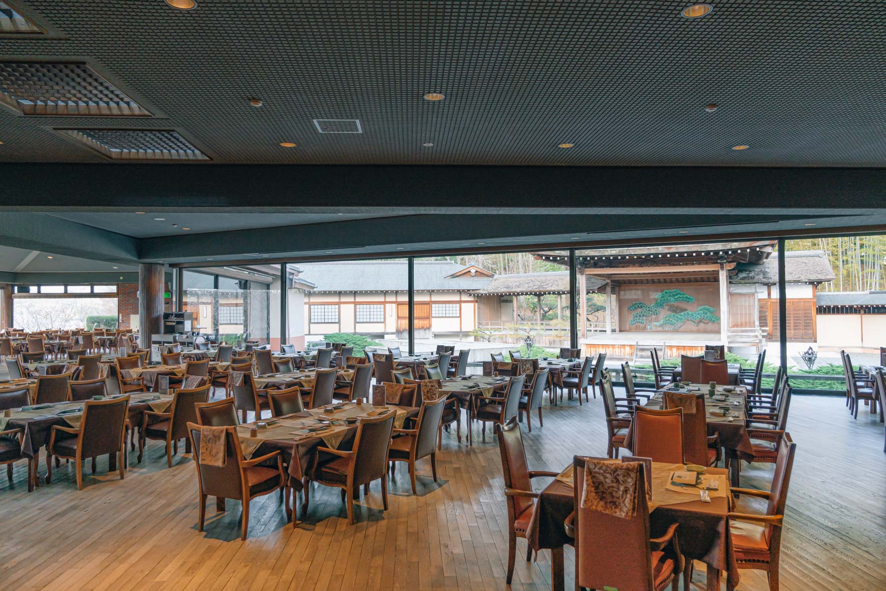 店内に一歩足を踏み入れると、高い天井と落ち着いた照明が印象的な空間が広がっていて、その奥の大きな窓の向こうには、能舞台の「有馬能楽堂」の姿が!