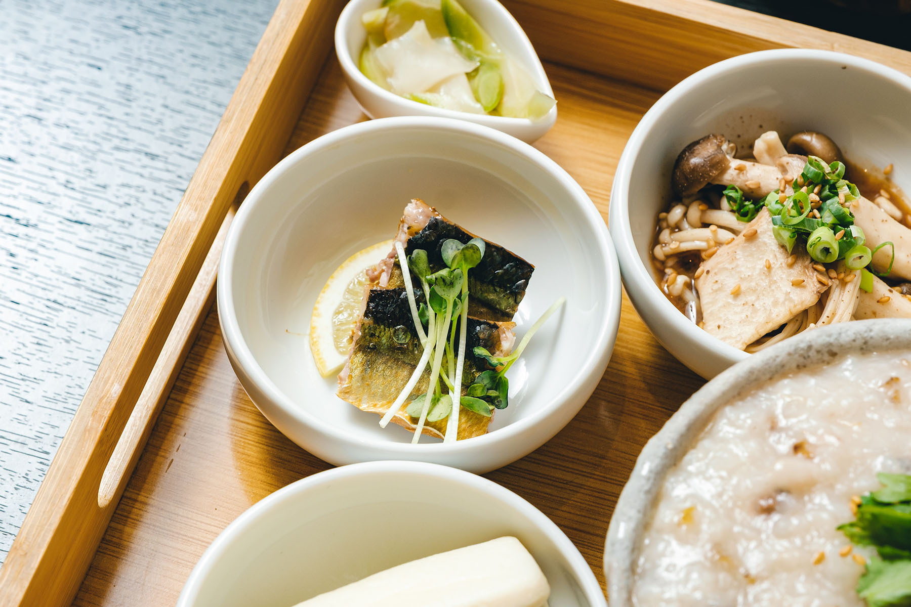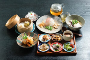 角煮バーガーや秋刀魚のジャスミン茶燻製など、秋らしい深みのある味わいを感じる一皿から、蒸し鶏と春雨の和物のように軽やかな副菜、さらに腐乳ソースを効かせたきのこの蒸し物といったコクのある料理まで、バランス良く並んでいます。
