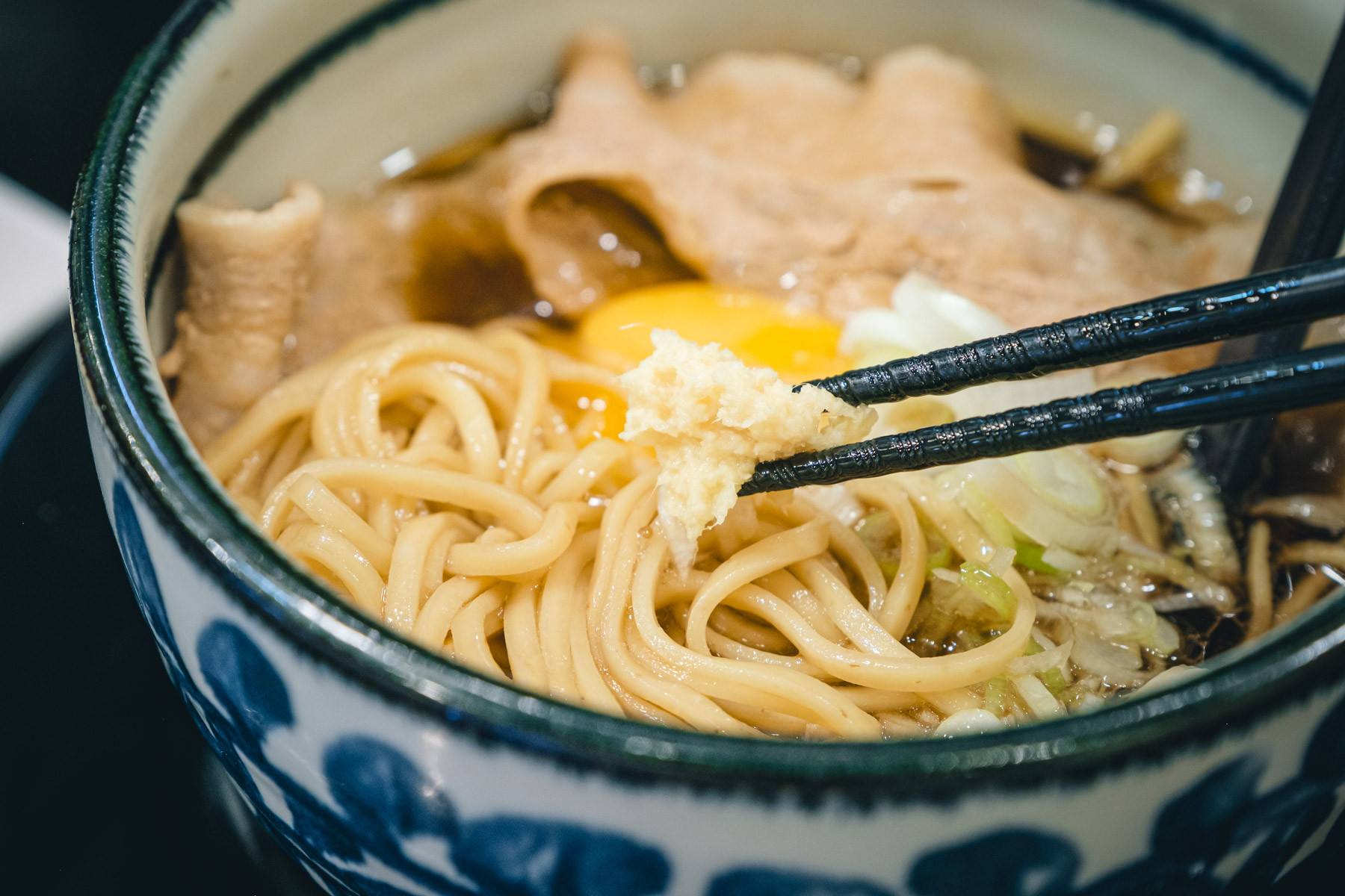 真ん中に乗った黄身はぷるんぷるんの弾力があって、見るからに新鮮そのもの!でもまずは割らずに、そのままスープのキレを楽しむのがおすすめ。