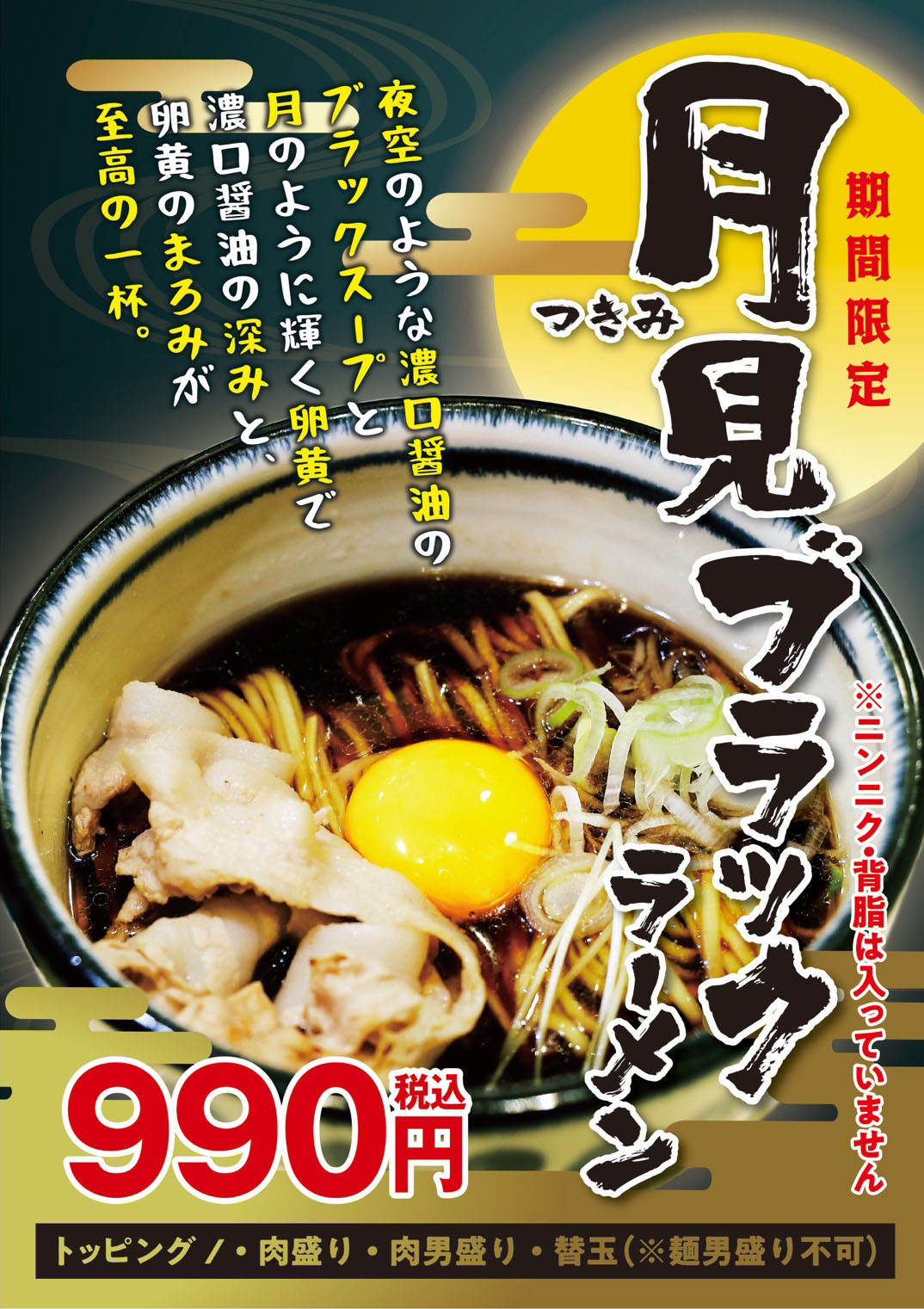 こちらの「月見ブラックラーメン」は、2025年11月1日(土)から神戸ちぇりー亭の「三田176号線店」さんだけで登場する、期間限定メニューです。黒と黄色のコントラストが生み出す衝撃を、ぜひ味わってみてくださいね!