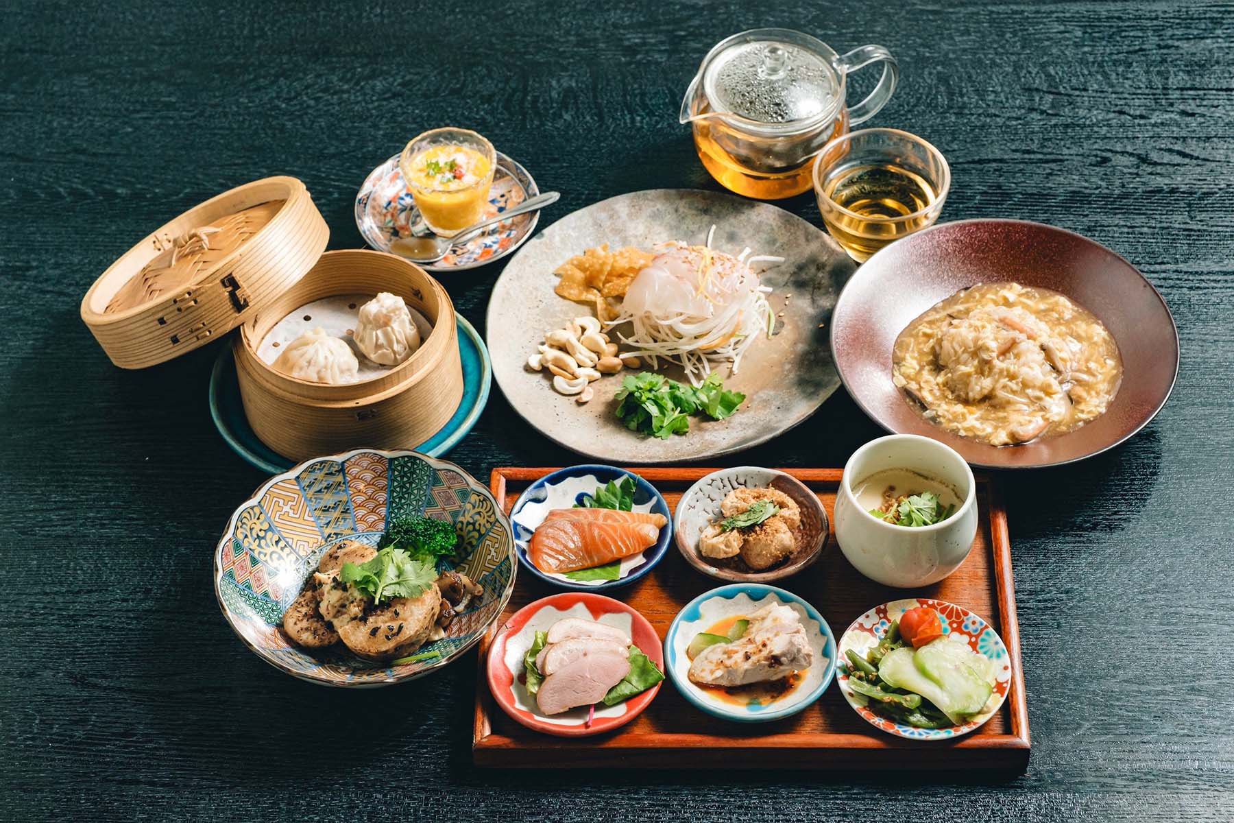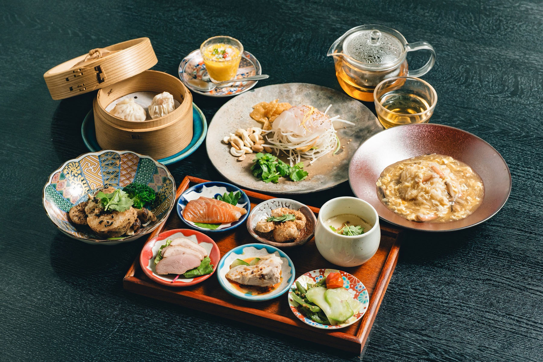 続く前菜6種盛りには、やさしい味わいの「かぶらの中華ポタージュ」や、香ばしい「根菜の金沙唐揚げ」、ほのかに香る「合鴨のジャスミン茶燻製」など、どれも丁寧な味つけで、ひと口ごとにほっとするおいしさが堪能できます。