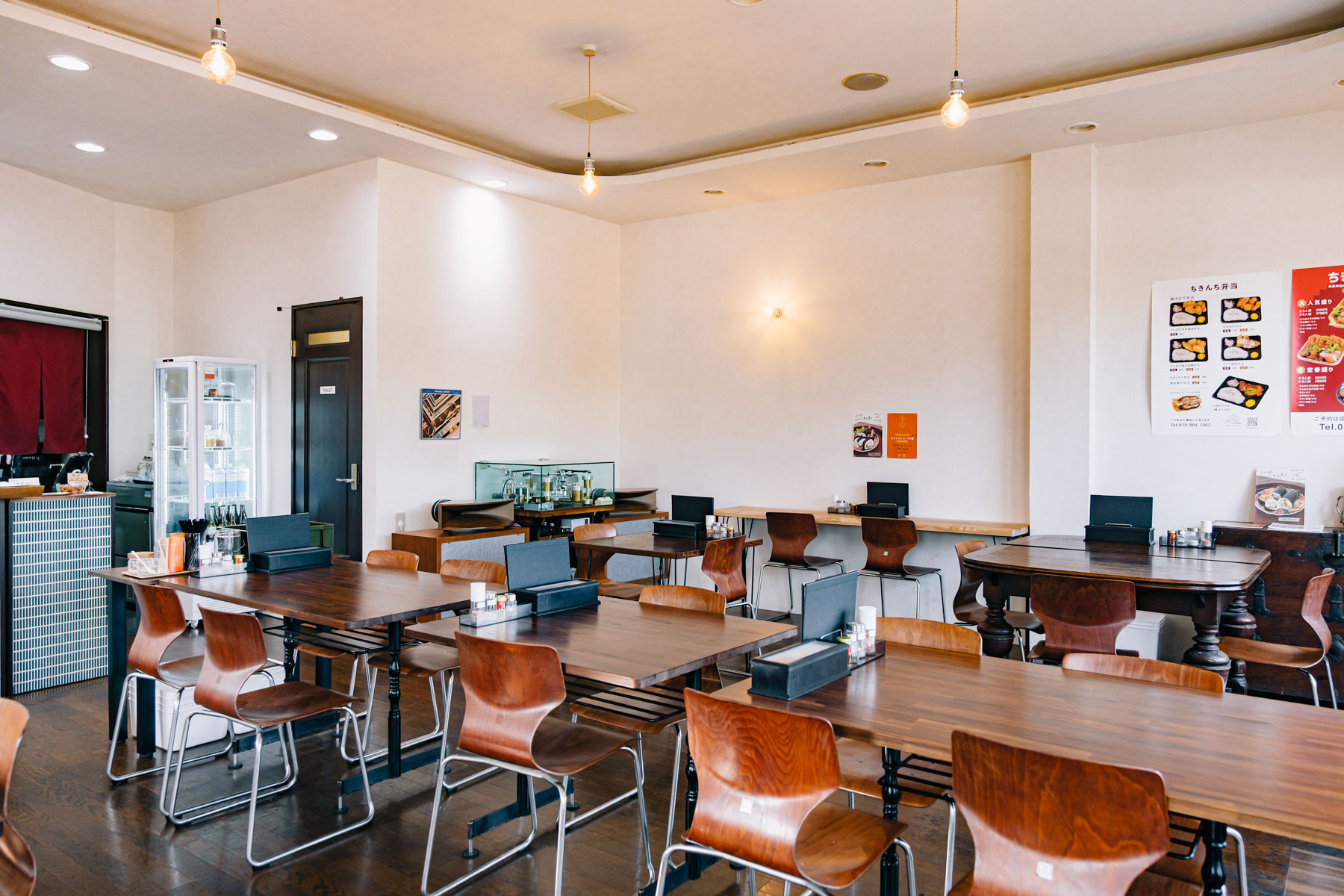 【食堂ちきんち】の外観と駐車場、店内の様子