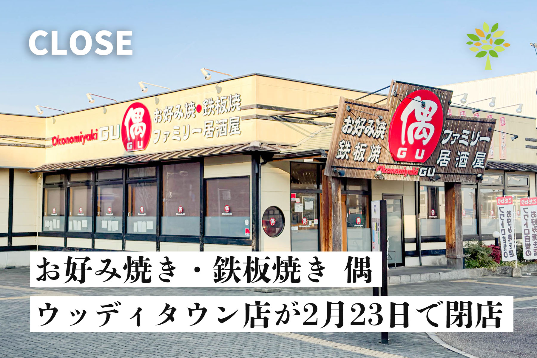 三田市けやき台の商業エリア「センチュリーガーデンフレスポ」内にある、お好み焼き・鉄板焼き・ファミリー居酒屋の「偶 三田ウッディタウン店」が、2026年2月23日(月祝)をもって閉店するみたいです。