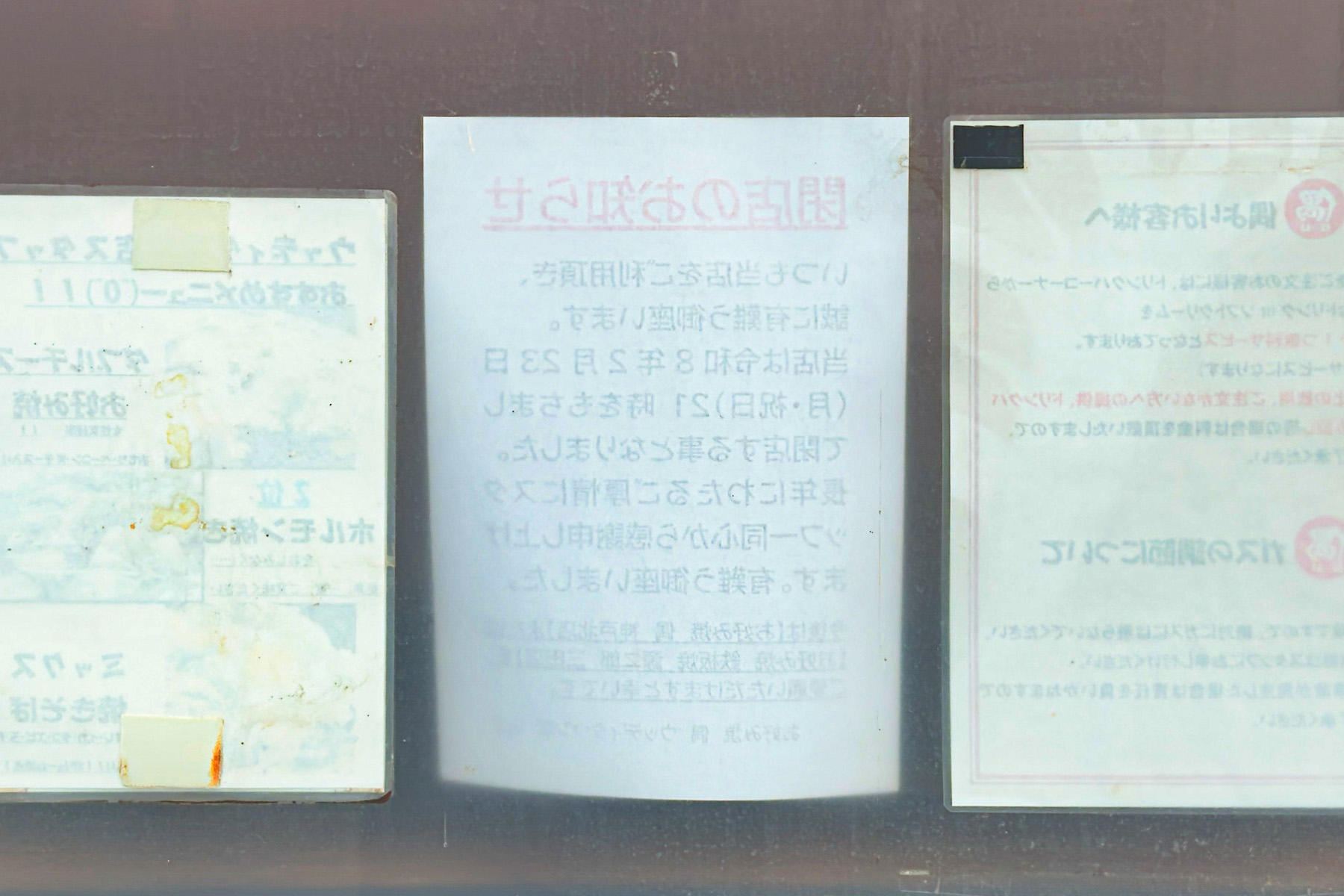 「どこかに閉店のお知らせ貼ってないかなぁ?」なんてことを考えながらお店の周辺を探していると、店内の窓になんかいろいろ案内が貼ってそうなところを発見。