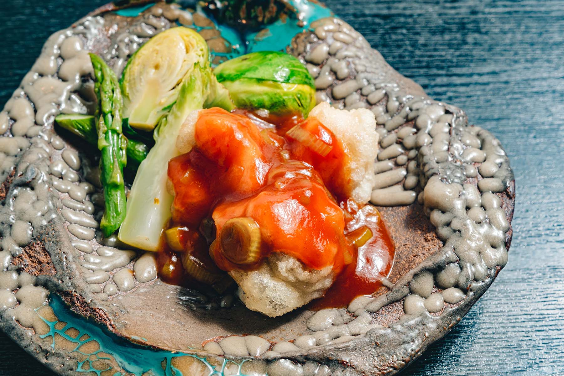 そこに添えられるのが、アスパラガスや芽キャベツなどの春野菜。シャキッとした食感と甘みが、濃厚なチリソースの最高のお口休めに。一口食べるごとに多幸感に包まれる、圧巻のメインディッシュですよ♪