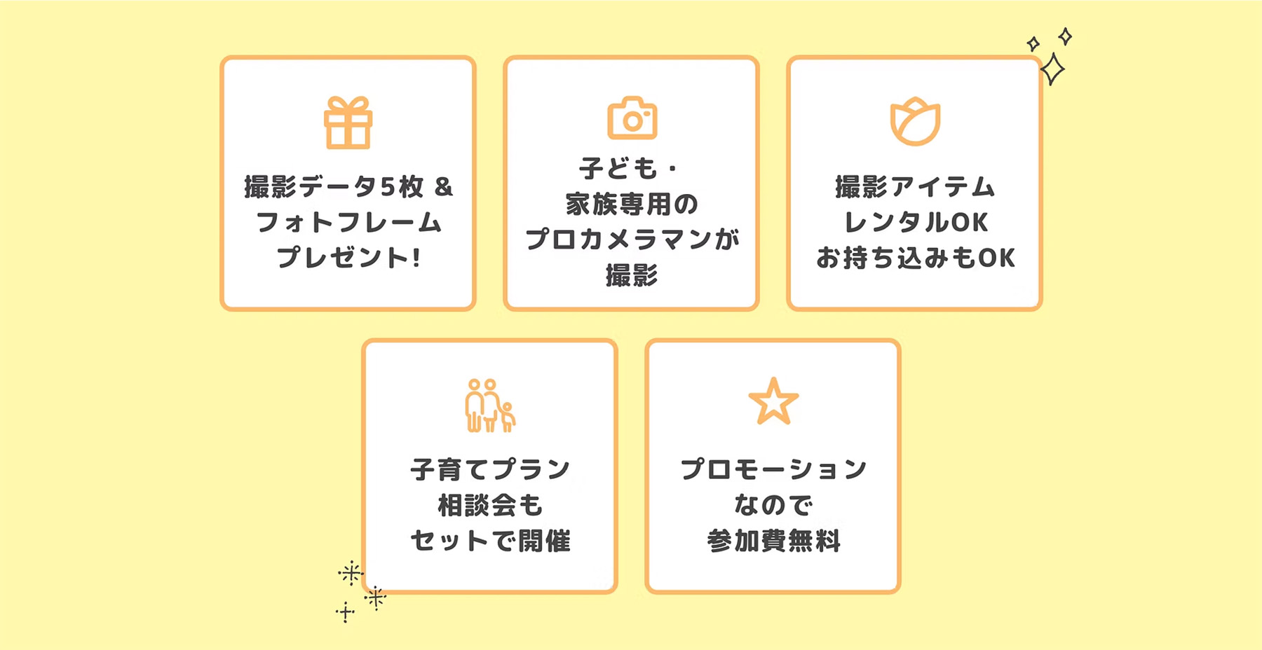 今回はプロモーションにつき、撮影データ5枚もプレゼントしております。ぜひご家族の“今”を残す思い出づくりにご参加ください。