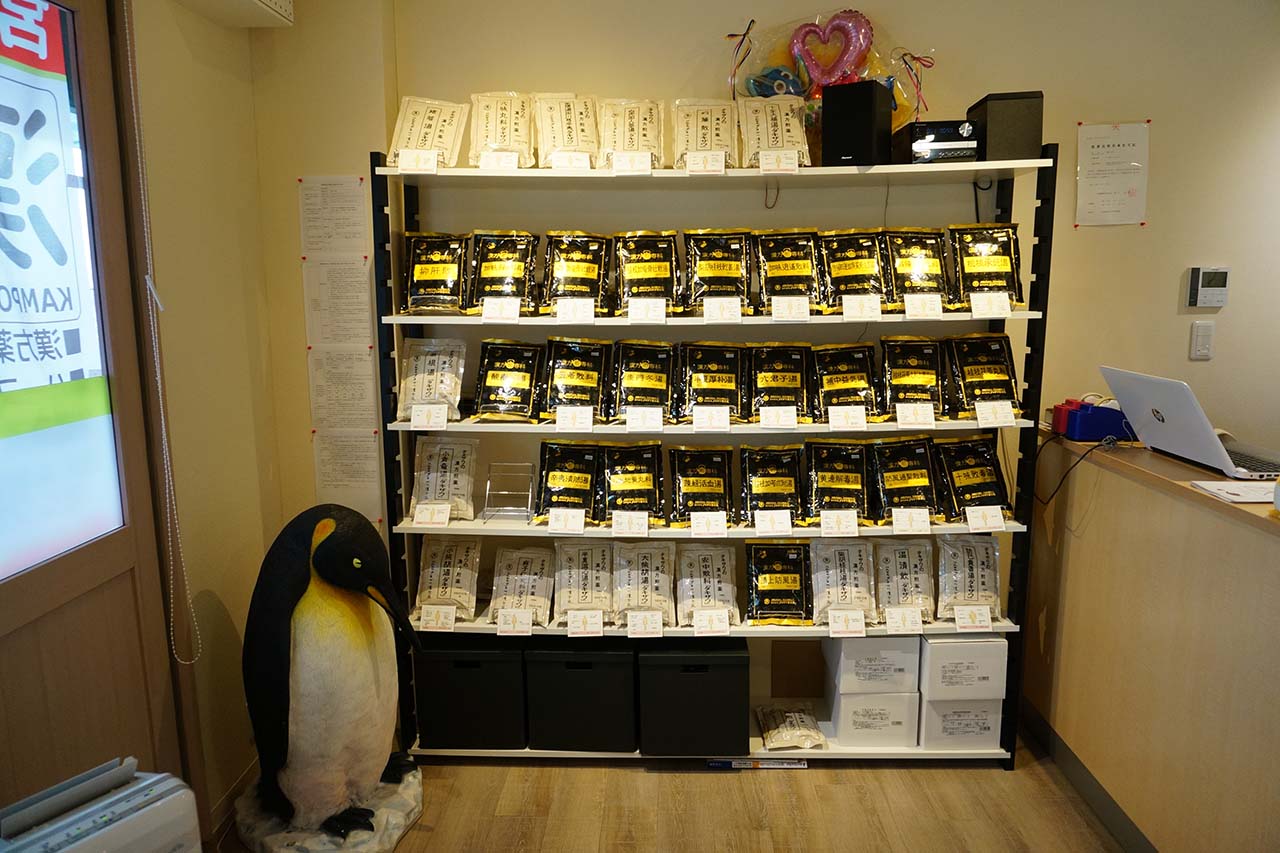そして反対側の棚も漢方薬でビッシリ!店名にもあるマスコットのペンギンさんも、漢方薬の色と何気にマッチしていますね。