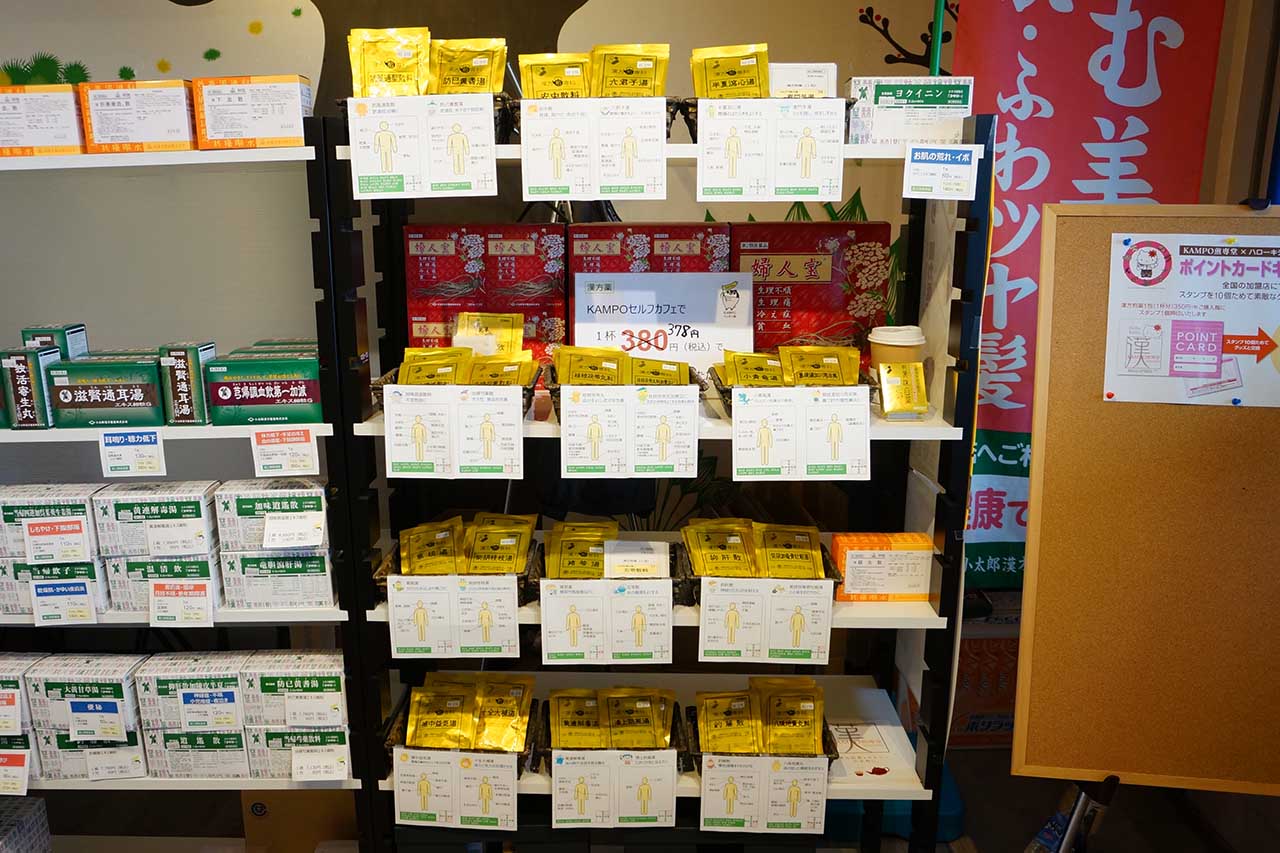 お店の外の看板を見ると、漢方薬のほかにもハーブティーや健康茶があるようですね。あと「KAMPO セルフカフェ」っていうのも気になります。では早速、中に入ってみましょう!