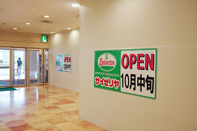 1Fのエントランス左手、以前は「ホリーズカフェ」というカフェがあったのですが、いつの間にか閉店しちゃっていました。全く知らなかった…。そしてそのエリアに、「サイゼリヤ10月中旬OPEN」の張り紙がありました。