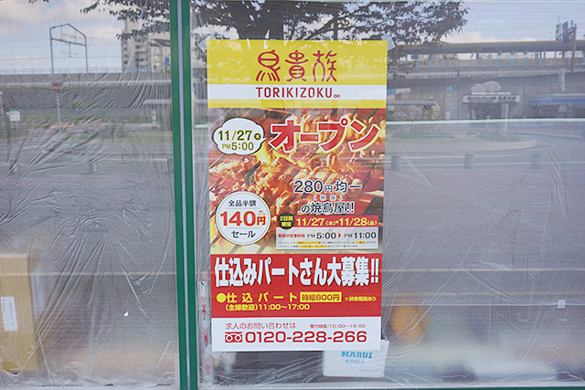11月27日(木)のPM5:00にオープンするみたいですね。オープン日とその翌日の11月28日(金)は、いつもは280円均一の焼鳥が、全品半額の140円になるというじゃないですか!ド平日なのがツラいところですが、これは行ってみたいですね。